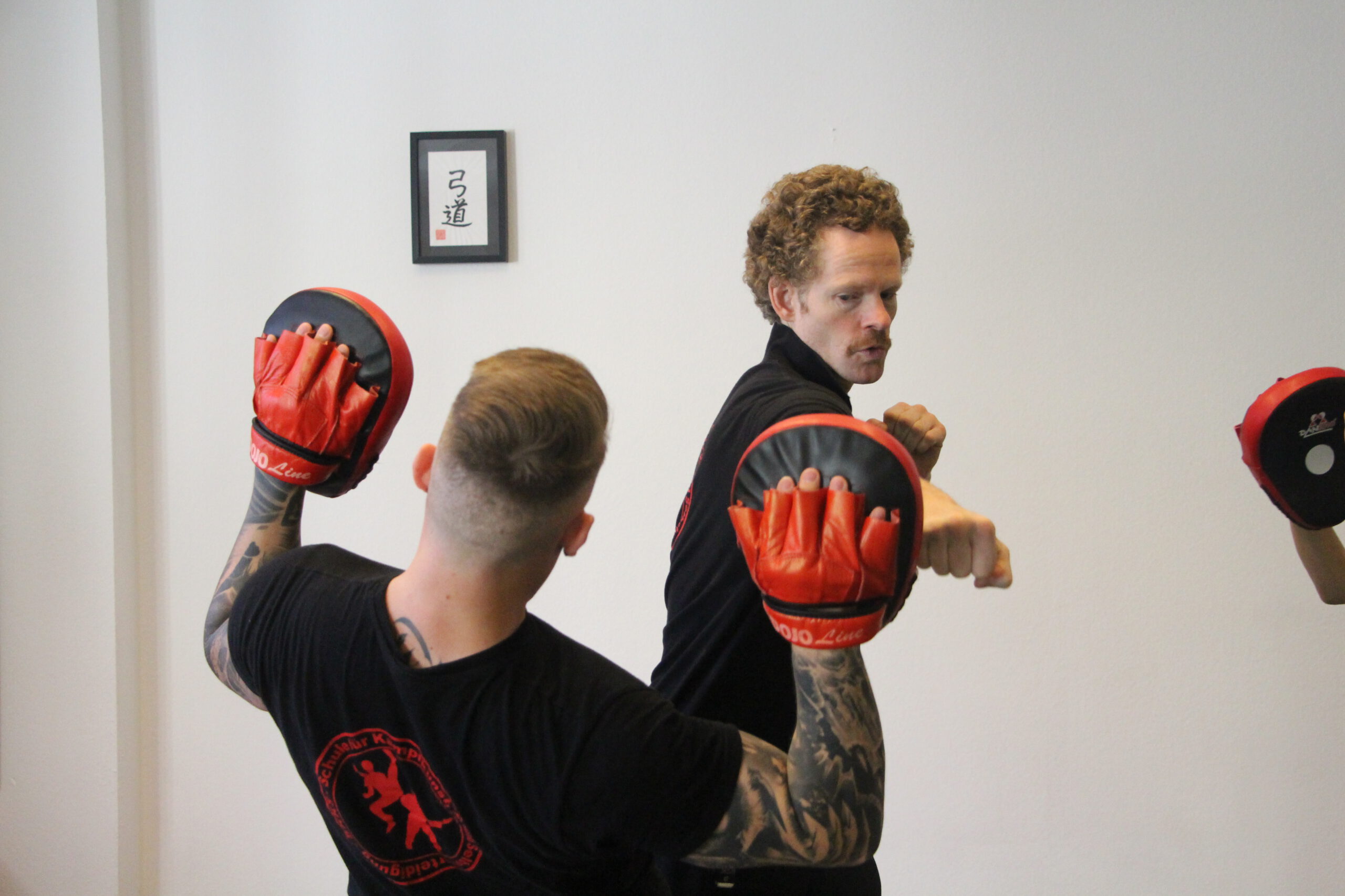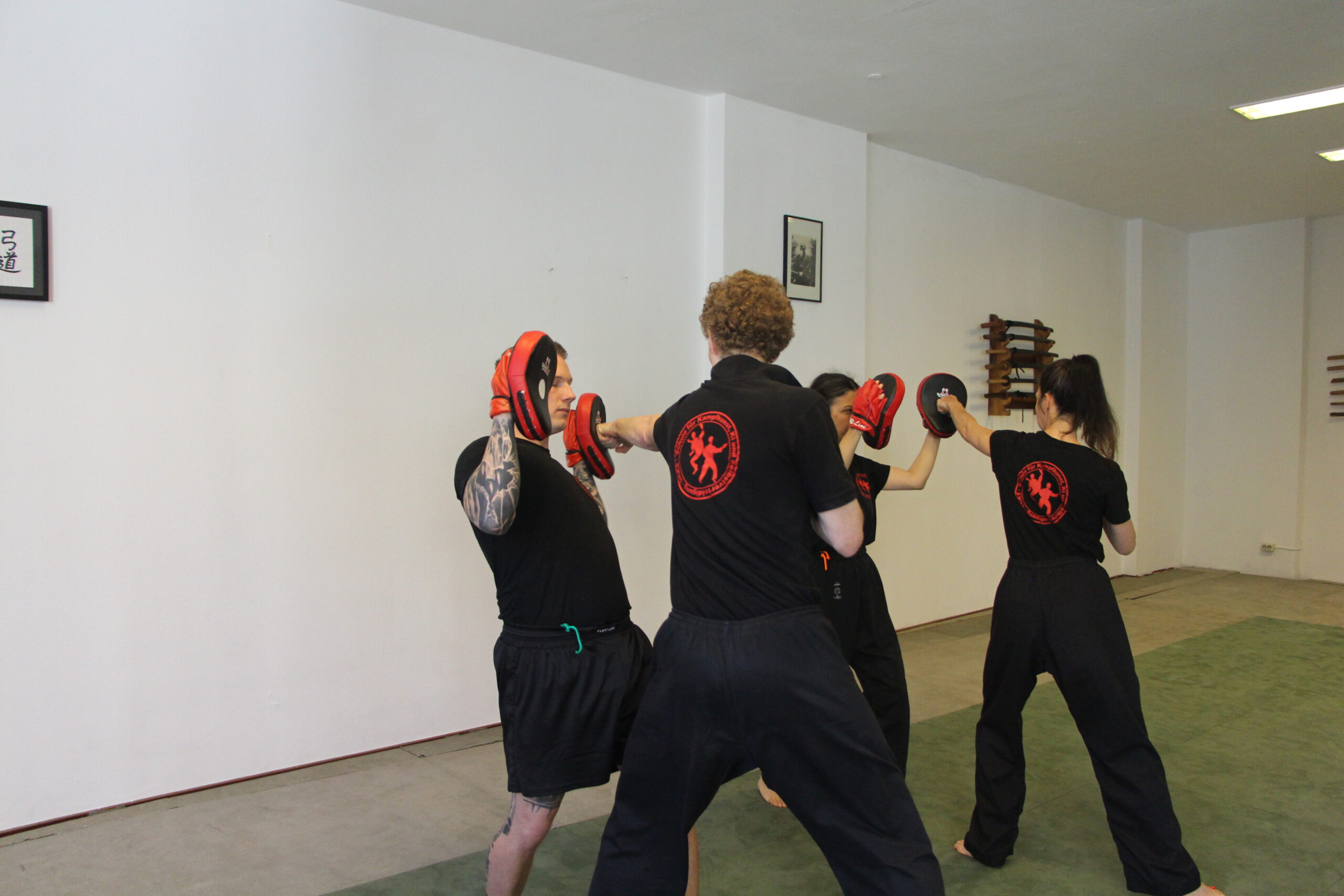 Auch Schlagpolster- und Kampftraining sind möglich. Das Kampftraining findet mit leichtem Kontakt und unter Benutzung der optimierten Protection Fighting Schutzausrüstung statt, die ein Maximum an Sicherheit bietet. Ziel ist sich gegenseitig zu stärken und gutes Reagieren zu üben, nicht aber Verletzungen herbei zu führen.